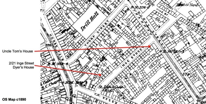However, Martha and Dyer had not been gone more than 10 minutes when he reappeared, white faced, and threw himself into a chair in Margaret Moran’s house before crying out, “Oh Maggie! I’ve done it. Save her if you can.” Even by the gloom of the candlelight which flickered in the room, Margaret could see there was blood streaming down Dyer’s fingers. Something terrible must have happened back at Inge Street and without seeking further clarification, Margaret together with both her lodgers, ran to the house Martha Simpson shared with Dyer. There they found Martha sitting in an armchair, a massive gaping wound in her throat and blood pouring down her clothes. She was already beyond all help.