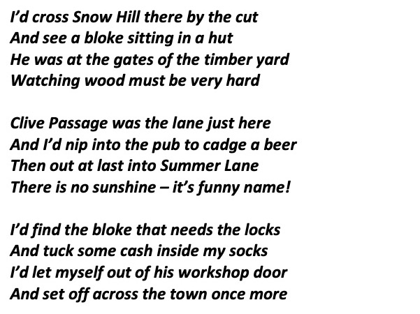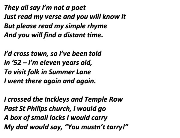 Uncle Tom (Thomas Mitchel) was just 11 years old in 1852 when he wrote this poem about a walk from his home in Inge Street to Summer Lane, with a small parcel of locks.