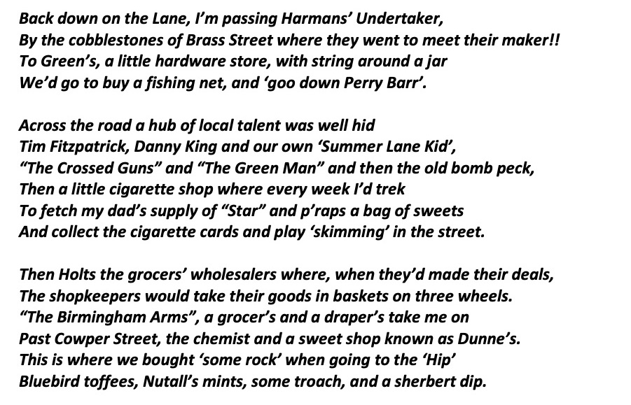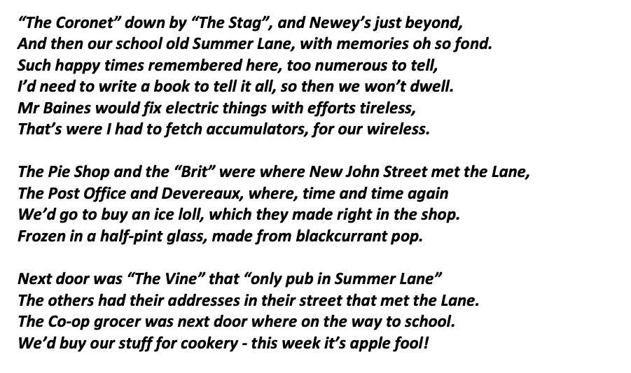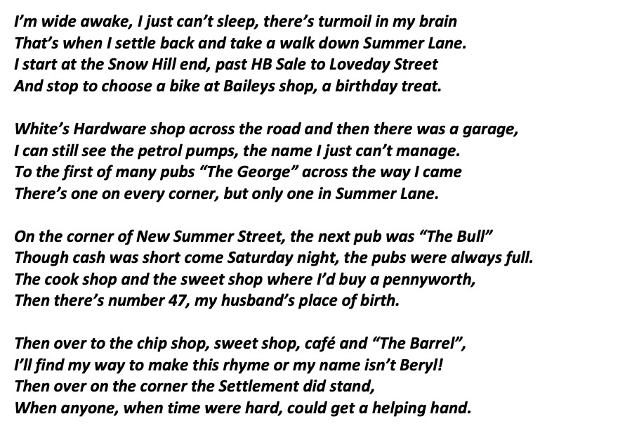 Beryl Evans lived in Summer Lane as a youngster and after the turn of the century wrote this poem from her childhood memories of “The Lane”.