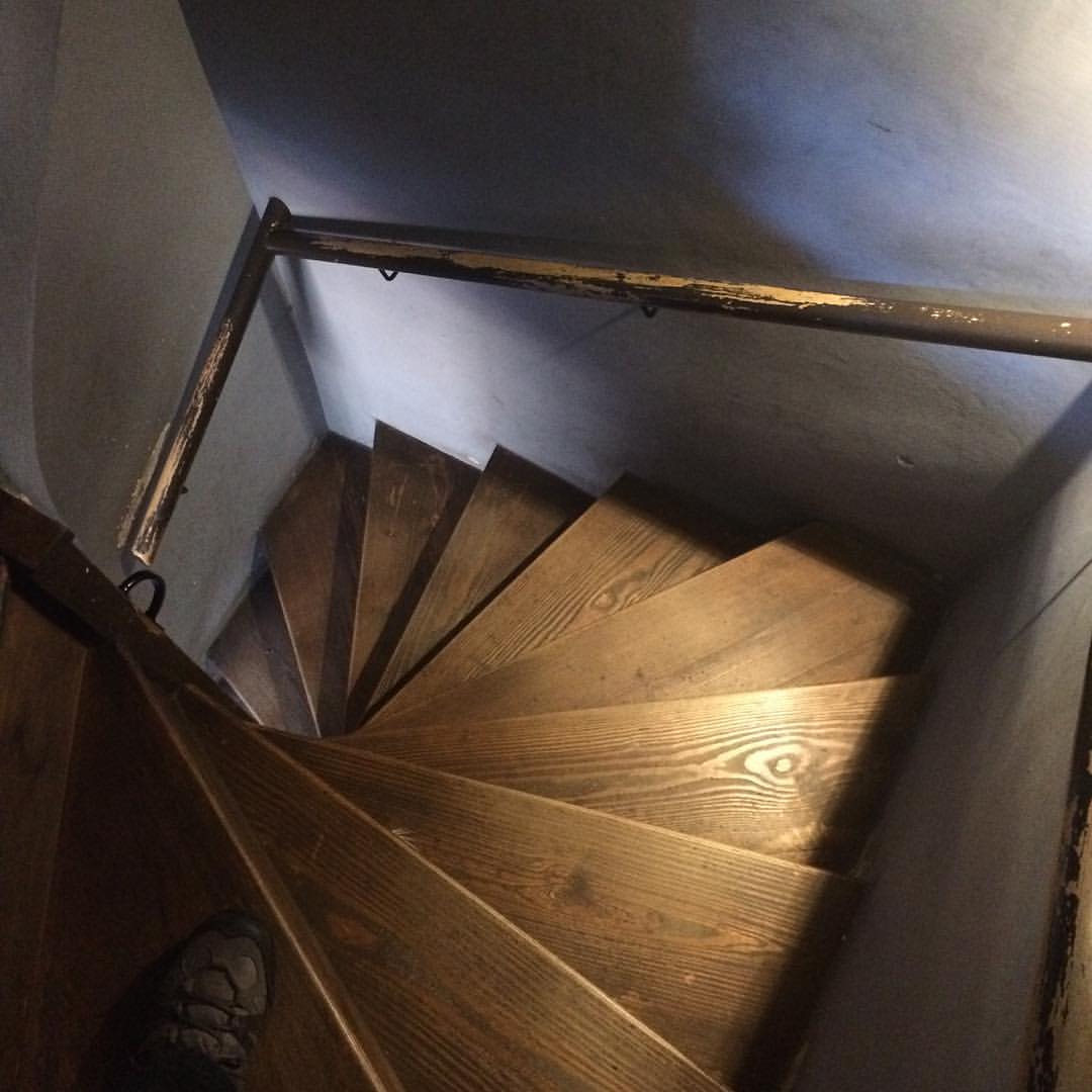 With that thought in our minds, let us go down stairs. Take care – going down can be as much as a challenge as climbing up these narrow spiral staircases. Many folk go down sideways with their feet on the wider part of the treads and their back to the handrail. In reviews of the Back-to-Backs most people’s most vivid memories are of the spiral staircases!