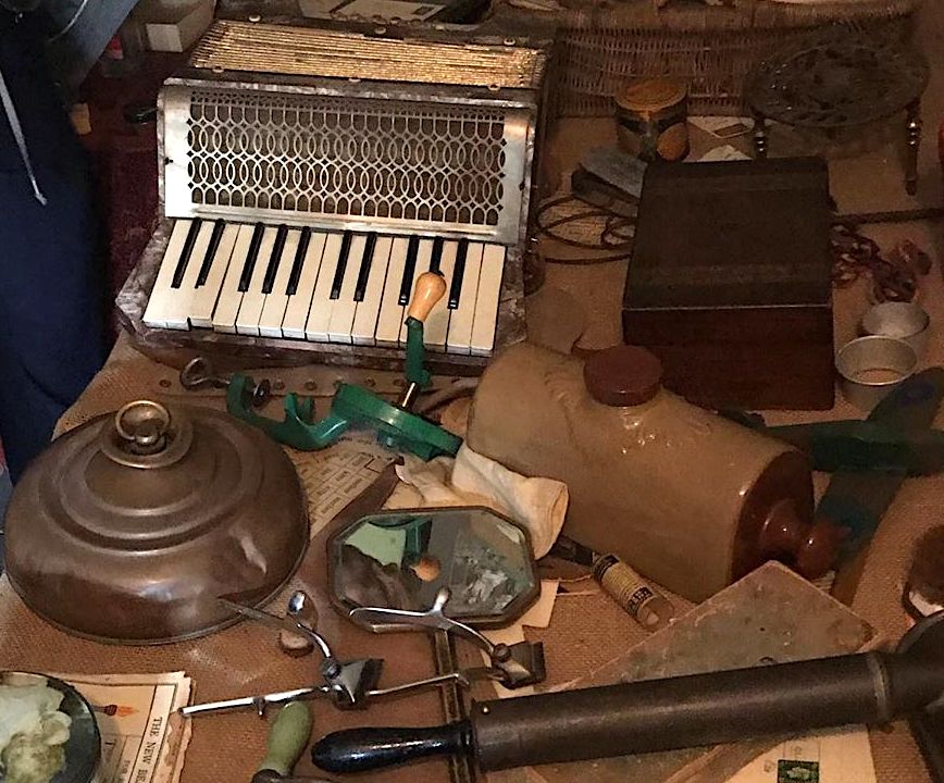 There are children’s clogs, a number of cameras, children’s toys, and hair clippers. There is also an early vacuum cleaner, a copy of the radio times from the 1930s and scales from a shop. The most appropriate is a box of tools – now that’s really “bloke’s” stuff.